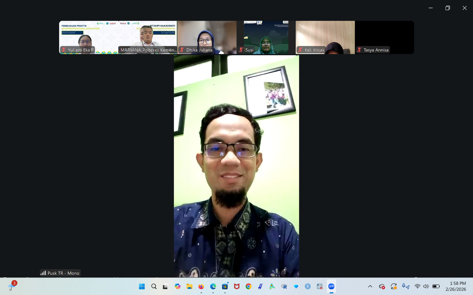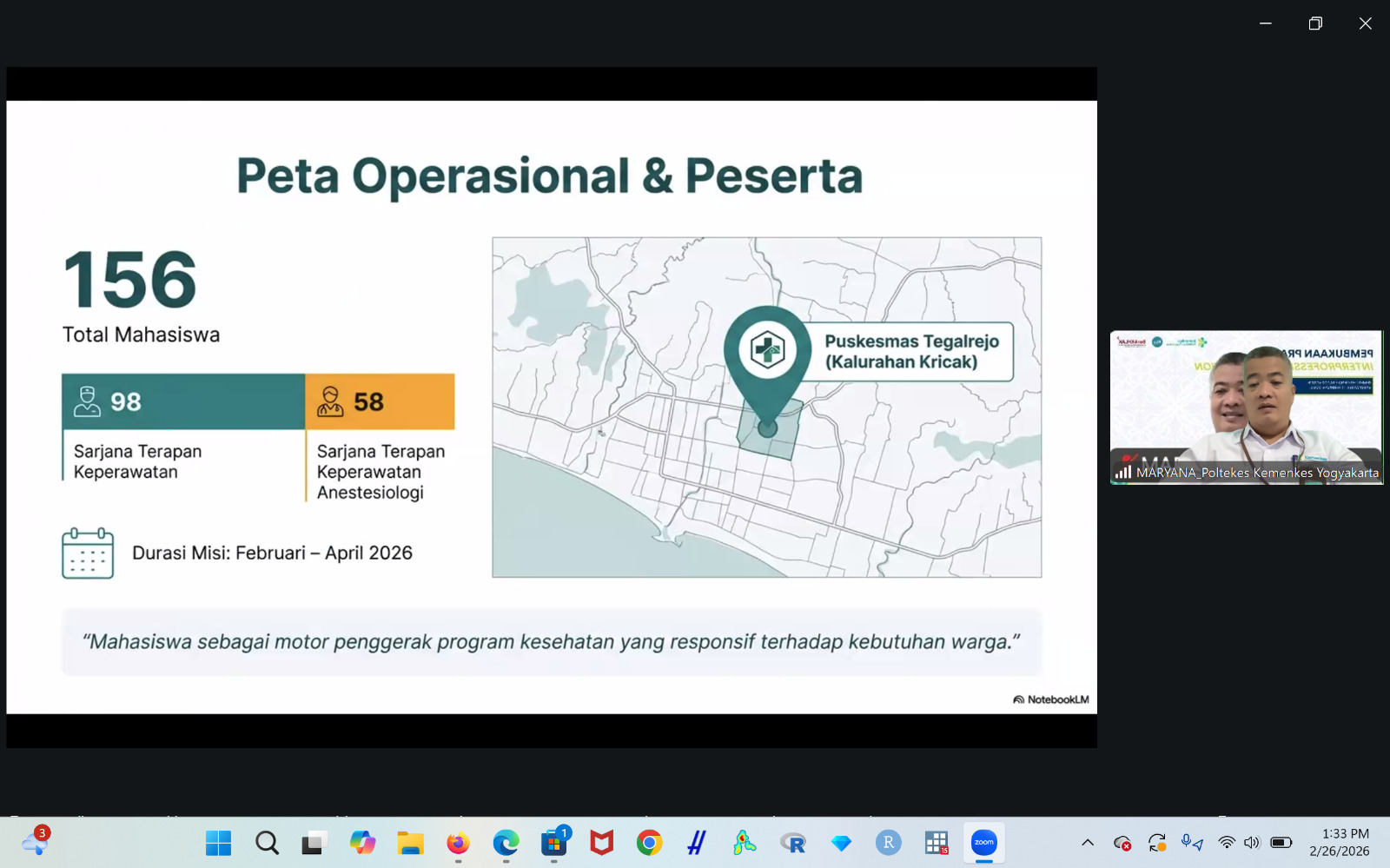 Pusat Pengembangan Pelatihan Poltekkes Kemenkes Yogyakarta menyelenggarakan kegiatan Pembukaan Praktik Interprofessional Education (IPE) pada Kamis, 26 Februari 2026 secara daring melalui Zoom Meeting. Kegiatan ini diikuti oleh 156 mahasiswa yang akan melaksanakan praktik kolaborasi antarprofesi di bidang kesehatan.
